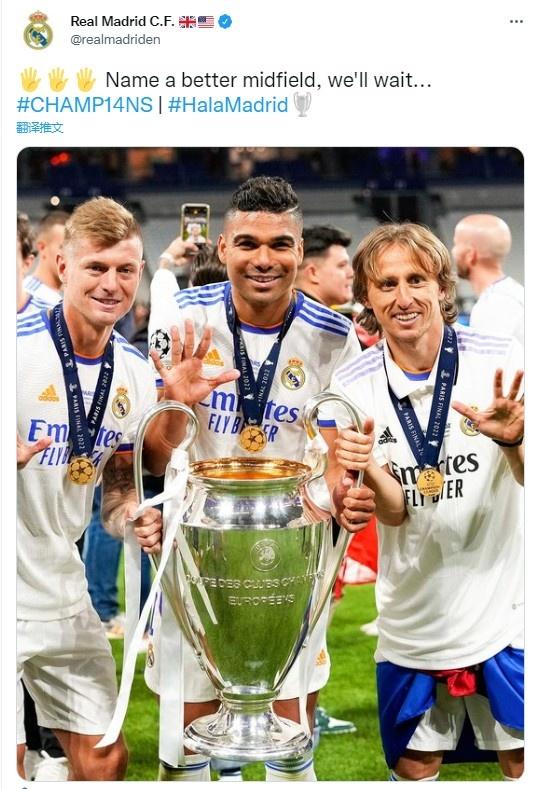 (图)欧冠决赛皇马1-0利物浦,夺得队史第14座欧冠。赛后皇马官推晒出莫德里奇、克罗斯、卡塞米罗和欧冠奖杯的合照。并配文:说出一个更好的中场,坐等!