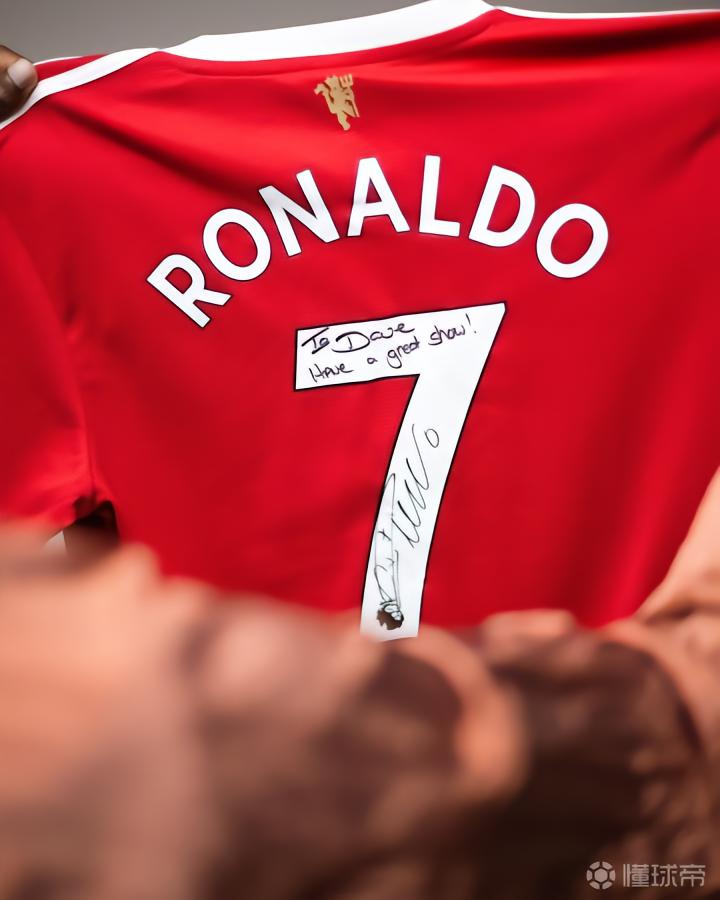 Santan Dave在个人社交媒体晒出一件C罗亲笔签名的曼联7号球衣,上面写着:“To Dave,祝你奉献一场精彩的演出。”