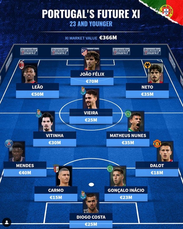 多年以来C罗一直都是葡萄牙国家队的标志和核心球员,那么如果未来C罗退役,葡萄牙国家队的实力如何。德国知名足球数据网站“转会市场”列出了葡萄牙国家队的U23阵容,马德里竞技前锋菲利克斯和米兰攻击手莱奥领衔。这套阵容总身价达到3.66亿欧,“转会市场”评论,葡萄牙的未来有很多青年天才,这也许会是新的黄金一代。