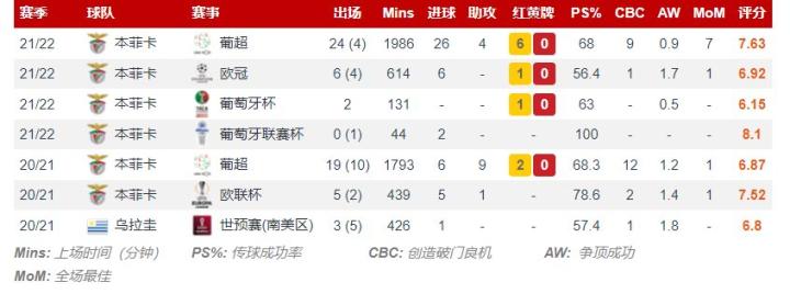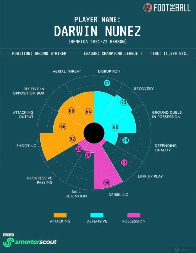 ?最近有关努涅斯的传闻很多,今天给大家介绍一下,大家感兴趣的话给我点个关注支持下?? ? 达尔文·努涅斯(Darwin Núñez),全名达尔文·加夫列尔·努涅斯·里韦罗(Darwin Gabriel Núñez Ribeiro),1999年6月24日出生于乌拉圭阿蒂加斯,乌拉圭足球运动员,场上司职前锋,现效力于葡萄牙足球超级联赛的本菲卡足球俱乐部⚜️⚜️ ?图一是努涅斯职业生涯简单数据 ?图二为努涅斯职业生涯伤病历史 ?简单为大家介绍后,有人会问努涅斯有什么特别之处? ?? 努涅斯身高1.87米,是一名正印中锋,他善于杀入禁区,完成临门一脚。 在前一个赛季遭遇了几次伤病后,努涅斯本赛季突然爆发了。虽然葡超不属于五大联赛,但努涅斯却能在五大联赛射手榜上排名第9。? 努涅斯还是一名高效的盘带者。来自Soccerment的统计数据显示,当涉及到盘带尝试时,努涅斯排在第18位,但他的成功率超过50%,这表明他在对手半场持球推进方面有很好的诀窍。 此外,努涅斯的预期进攻附加值(xOVA)排名2,这个数据能更有效地衡量球员的效率,因为如果球员在获得有价值的传球后丢掉球权,他们将会受到惩罚。? ‼️努涅斯本赛季的杀手本性 如果说本赛季努涅斯展现出了什么特点的话,那就是射手是最适合他的角色。当然,很多球员都能进球,但努涅斯的独特之处在于他进球的效率。 Soccerment的统计显示,努涅斯在他的28次射门尝试中打进了18个球。进球转化率达到64.28%,在葡超球员中排名第一,这是相当惊人的。而他的进球转化率要比排名第二的里卡多·奥尔塔和第三名的路易斯·迪亚斯高出10%。?? 需要注意的另一点是,虽然努涅斯在2020-21赛季更多地参与了进攻的组织,但在同一赛季的欧联杯比赛中,他更多地被安排在了进攻核心的位置,所以才有了他的5个进球和1次助攻。 Smarterscout对0-99岁球员的各种技能进行了评分,尽管努涅斯控球时的评分比较低,但他的进攻能力评分却相当高!!! ??接下来让我们来看看近些年努涅斯的身价变化 ?? 如果说卡瓦尼是可以打边路的中锋,那么努涅斯现阶段更像是因为身板突出而能打中路的边锋,踢法里经常出现边锋的意识和思路。 当然了,包括对抗技巧、支点技能,以及抢前点这种典型的中锋思维,都是可以靠后天训练和比赛经验得到提高的,不能因为现阶段的这些短板而降低对他的能力上限预期。 从基本素养来说,187cm的身高,目测80Kg上下的体重,在中路有条件做支点,而脚下扎实的基本功,以及没有过多影响的速度表现,让他也能完成拉边作业的战术任务。 这样一来,就有了在未来成为全能中锋的潜质。 如今的世界足坛,年轻的优秀中卫稀缺,进而导致年轻的优秀前锋也变得很少,像努涅斯这样边中皆能,边中皆有希望更进一步的前锋,不管是从个人实力还是战术价值,都是非常值得引进的球员。 职业生涯不出意外的话,谁买到,谁赚到。 ⬆️⬆️图7为努涅斯本赛季葡超的详细数据 ⬆️⬆️图8为努涅斯本赛季欧冠数据 ? 从数据来看,努涅斯本赛季地面对抗成功率只有47%,其场均成功争顶次数更是只有0.8次,只能排到同位置所有球员中的第41位。如此低的对抗成功率,自然不足以支撑努涅斯完成作为传统中锋的技术任务。因此,想要在其他方面发挥自身的优势,努涅斯除了在后卫的夹击下寻觅空间,必须要开发出更多的技术特点。 作为一名身高达到1米87的中锋,努涅斯并不以高空对抗著称。恰恰相反,这位乌拉圭国脚的特点反而来自于脚下。 ?? 如上图所示,截止到目前,努涅斯在本赛季的葡超联赛中场均过人数达到了1.6次,尽管比不上那些过人如麻的突破手,但依旧可以在联赛同位置所有球员中排到首位。而即便在高手如云的欧冠中,努涅斯的场均过人数也可以达到1.2次,在本菲卡队内排在第4名‼️ 努涅斯拥有不俗的瞬间爆发能力,往往可以在多人包夹中提前完成加速。与此同时,尽管作为中锋的活动范围以中路为主,但努涅斯得益于不错的瞬间爆发速度,往往可以在反击中作为球队的一大爆点寻觅反击机会。?? 所以我个人认为努涅斯并不是一位非常喜爱和后卫直接身体对抗的中锋,他在无球状态下的跑位相对灵动,希望通过反复的左右拉边来调动对方防线的整体站位,以此获得更大的拿球空间。努涅斯拿球后的操作也非常值得关注,无论是内切后的强行打门,又或者是外线下底传中,甚至和队友展开的小范围配合都非常具有威胁。‼️‼️ 本期内容到这里就结束了,感谢大家收看,支持的话给老弟点个关注♥️♥️感谢各位支持