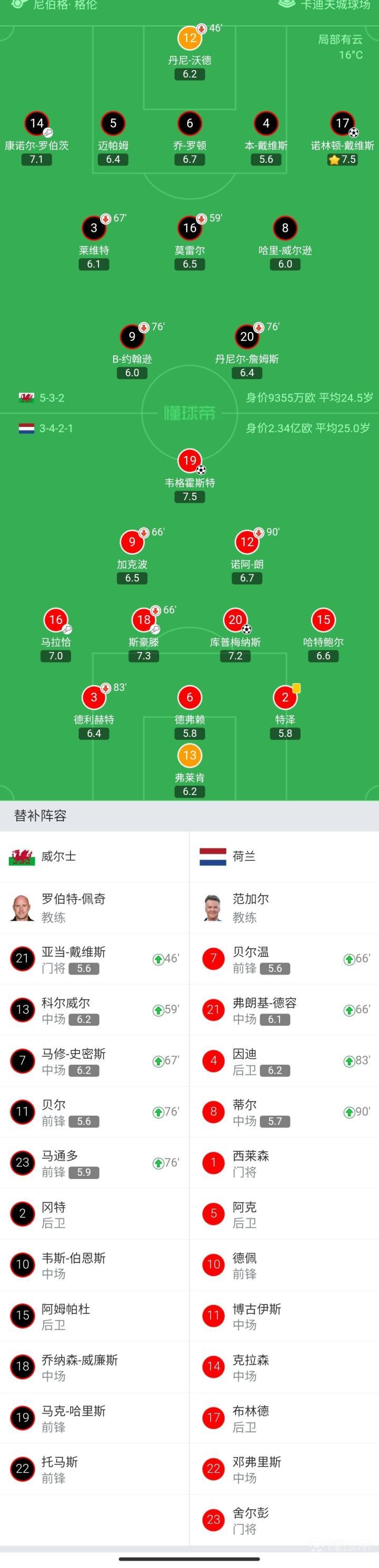 荷兰首发:13-弗莱肯、2-特泽、3-德利赫特(83′4-因迪)、6-德弗赖、16-马拉恰、18-斯豪滕(66′21-弗朗基-德容)、20-库普梅纳斯、15-哈特鲍尔、9-加克波(66′7-贝尔温)、12-诺阿-朗(90+1′8-蒂尔)、19-韦格霍斯特