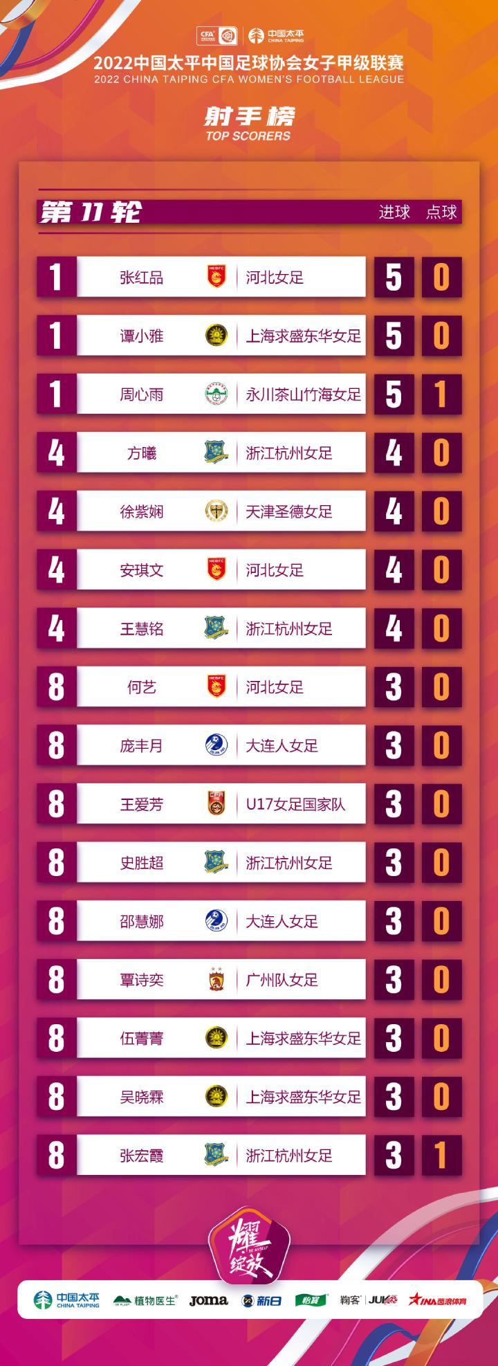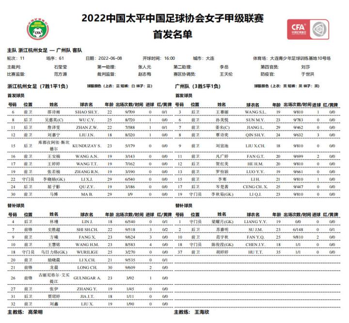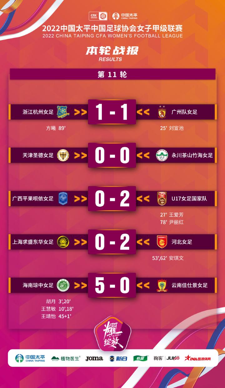11轮过后,浙江杭州女足8胜2平1负积26分位列榜首,广州队女足4胜6平1负积18分排名第六,两队携手打入争冠组。