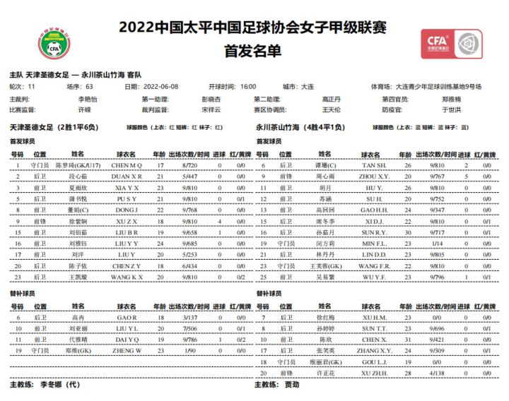 11轮过后,天津圣德女足3胜2平6负积11分排名第九,永川茶山竹海女足5胜5平1负积20分排名第四。
