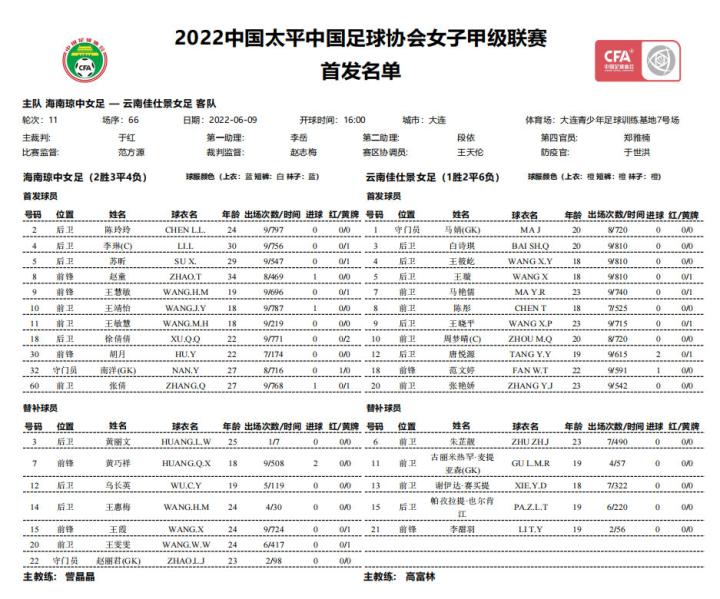 海南琼中女足王慧敏、胡月分别梅开二度,王靖怡破门得分。海南琼中女足4胜3平4负积15分排名第八结束首个女甲赛季,云南佳仕景女足2胜2平7负积8分排名第十结束本赛季女甲联赛。