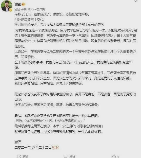 几天之后,谢晖决定辞去南通支云俱乐部主教练一职。