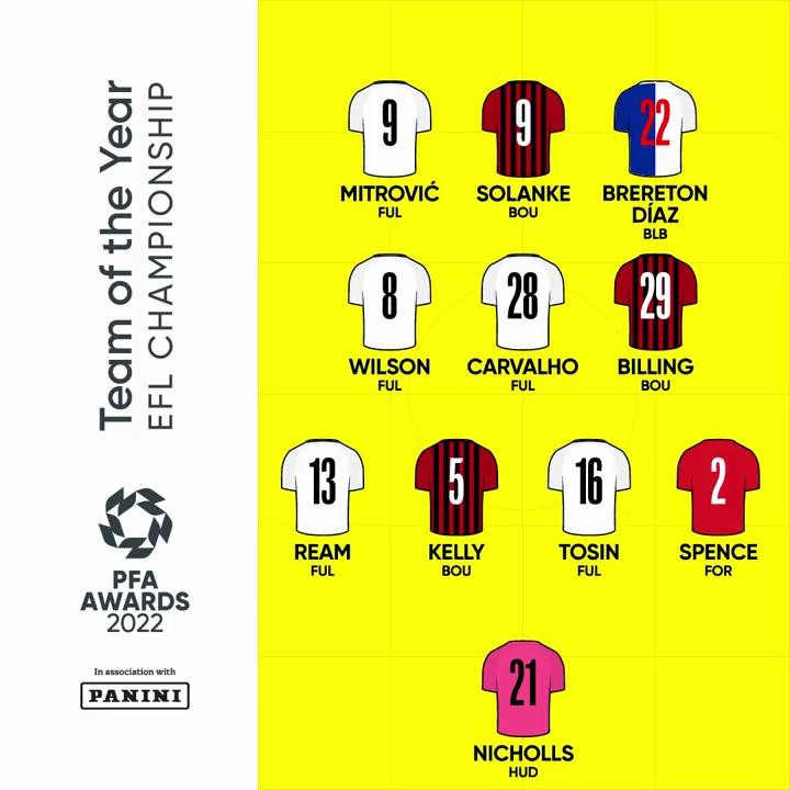 英格兰职业球员工会(PFA)公布了本赛季的英冠最佳11人名单,获得冠军的富勒姆有5名球员入选,排名射手榜前二的米特罗维奇和索兰克领衔锋线。