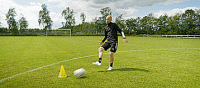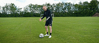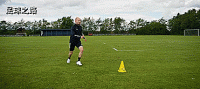 所以转身动作本身是相对简单的,事实上我们只需要靠近球一点,然后让球从身后滚过,身体倾斜一点,再用脚内侧轻拍到一边,接球触到90度方向。
