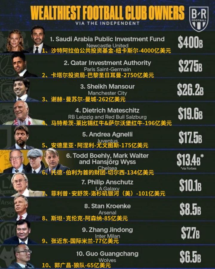 利物浦老板是身价28亿美元的美国期货大佬约翰·亨利,刚接手切尔西的老板是身价134亿美元的美国资管巨头古根海姆的前合伙人托德·伯利,曼城老板是身价262亿美元、现任阿联酋总统的弟弟谢赫·曼苏尔,巴黎圣日耳曼背后的是管理2750亿美元的卡塔尔投资局。