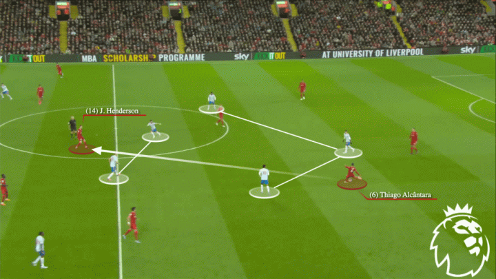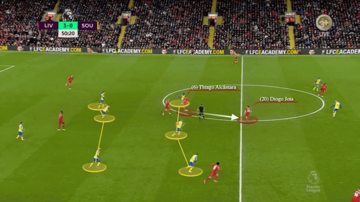 再看利物浦对阵南安普顿的这个例子,蒂亚戈简单地回做给同样在中圈内的若塔,但这次没有穿透任何一名圣徒球员,若塔和亨德森的接球位置差不多,效果却截然不同。