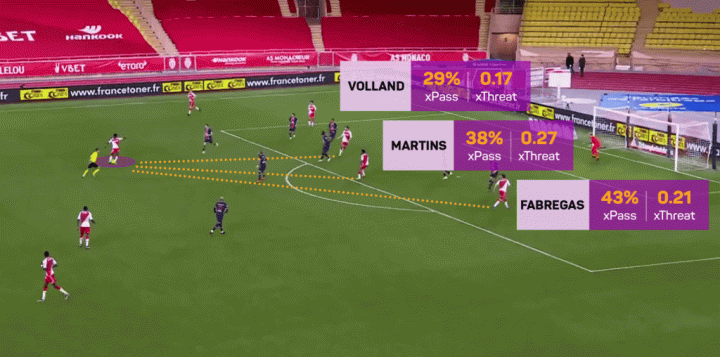 如下图所示,皇马新援琼阿梅尼在摩纳哥的一场比赛中有三个传球选择,传球成功率都不足50%,我们将“预期传球成功率”简称为“xPass”。