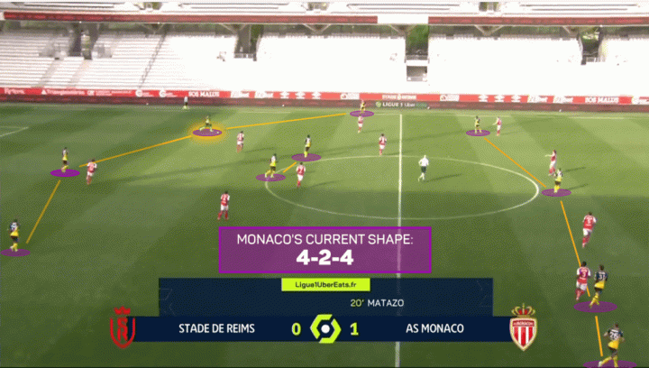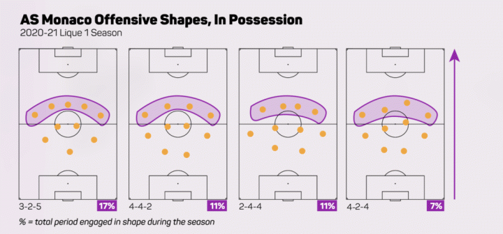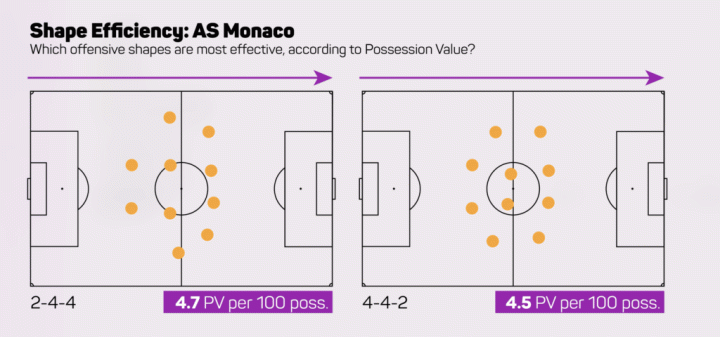 根据控球价值数据,摩纳哥在2020-21赛季最高效的阵型是2-4-4,每100个控球回合的PV达到4.7,略高于4-4-2。