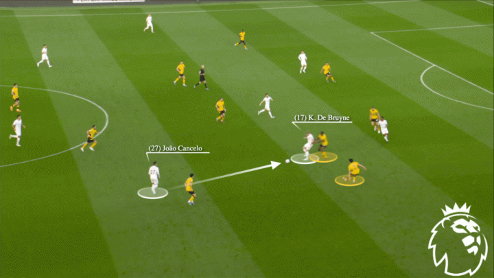 比如下图这个例子,曼城中场德布劳内接到了队友坎塞洛的传球,有两名狼队球员上前向德布劳内施压……