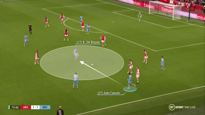 ……这就和德布劳内对阵阿森纳时在大致相同区域接到传球的情况截然不同,枪手球员此刻几乎没给丁丁造成任何压力。