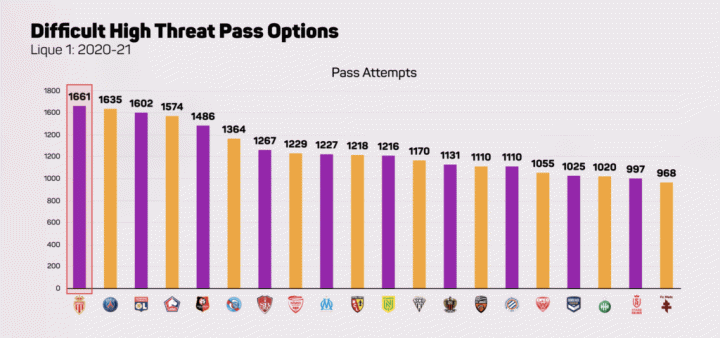 如果计入2020-21赛季法甲联赛所有“高风险高回报”的传球,摩纳哥的尝试次数高居联赛第一,他们那个赛季也排在里尔和大巴黎之后获得联赛第三。