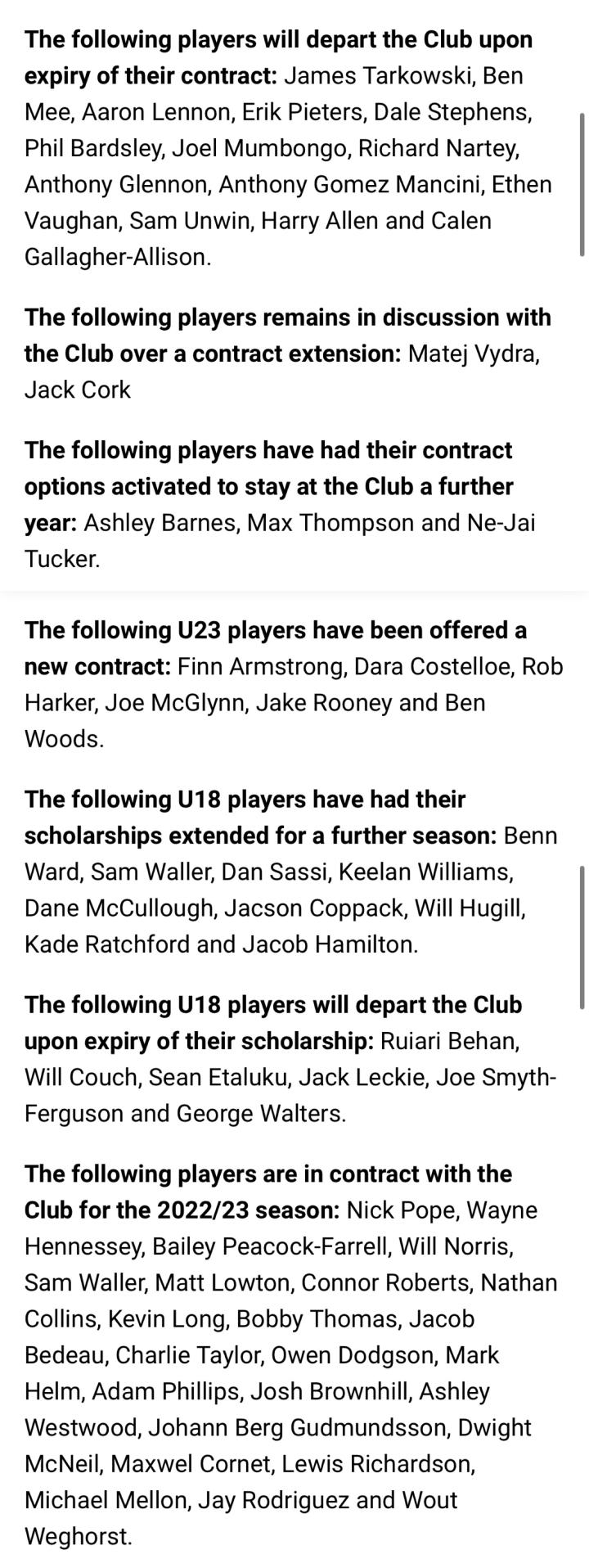 官方:伯恩利足球俱乐部离队/续约谈判进行中的球员名单公布