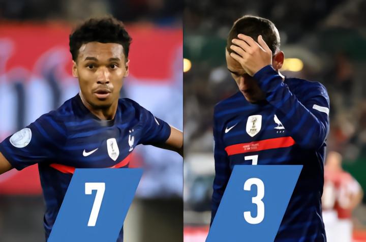 在队报的评分中,国家队新人卡马拉拿到了7分,此外依旧表现不够好的格列兹曼只拿到了3分。