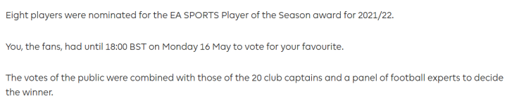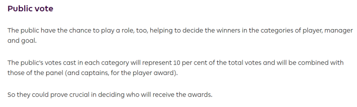 当地时间5月12日,英超官网发布的赛季最佳球员提名新闻稿上,明确写出了,球迷可以在当地时间5月16日18时之前参与投票,并且公众投票,会计入最后的评选。