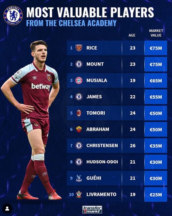 英超切尔西俱乐部有很多出色的青训球员,德国知名足球数据网站“转会市场”列出了出自切尔西青训俱乐部的球员目前身价排名。其中芒特和西汉姆球员赖斯身价排名第一,穆西亚拉排在第三。