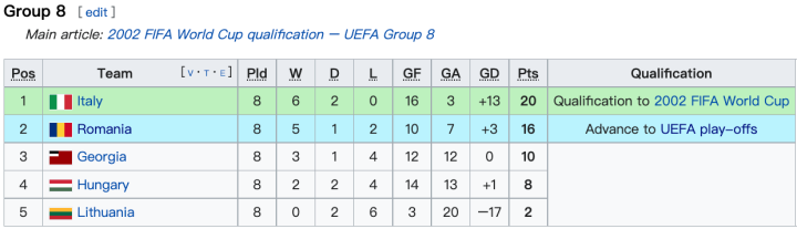 第3轮罗马尼亚轮空,意大利在2000年10月11日凭借皮耶罗的梅开二度拿下格鲁吉亚,也不知道当年这个组赛程是人为安排还是咋的,第4轮也就是2001年的3月24日,罗马尼亚与意大利再度相逢,罗马尼亚也是悲催,小组赛其他对手面都没见全就两碰意大利,结果这场生死战意大利人防守反击打的炉火纯青,因扎吉上半场的梅开二度也让比赛结果失去悬念,更让这个组的直接出线名额尘埃落定。4轮过后,意大利人10分遥遥领先,而罗马尼亚虽然少赛一场但只有可怜的3分。