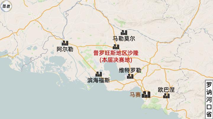 罗讷河口省的省城是马赛,它也是普罗旺斯-阿尔卑斯-蔚蓝海岸大区的首府,并且是法国人口第二大城市,介于巴黎和里昂之间。但赛事移师罗讷河口省之后,却从未在马赛进行过比赛,其选择举办地全部是附近的小型城市。