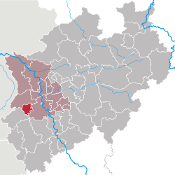 门兴格拉德巴赫是位于德国北莱茵-威斯特法伦州杜塞尔多夫以西的一座直辖市,杜塞尔多夫是北威州的首府(如下图深红色地区为门兴格拉德巴赫市)。同样位于该州的城市还有波鸿,多特蒙德,科隆,勒沃库森,比勒菲尔德等。所以理论上说,德甲经常就是北威州德比,但位于该州的城市的球队太多,所以较少提及。门兴格拉德巴赫位于莱茵河以西,值得一提的,门兴足球俱乐部的死敌并不是大家所熟知的普鲁士德比对手多特蒙德,也不是德甲霸主拜仁慕尼黑,而是同样位于莱茵河畔,在门兴上游的科隆足球俱乐部。