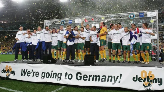 在世预赛洲际附加赛历史上,澳大利亚是经验最丰富的球队。之前在大洋洲曾经多次参加洲际附加赛,到了亚洲,袋鼠军团仍然没能逃过洲际附加赛的考验。图为2005年的洲际附加赛次回合结束后,澳大利亚将帅在欢呼'We are going to Germany!'的名场面。