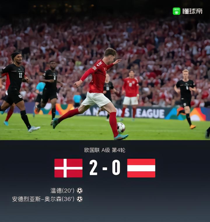 丹麦2-0奥地利,温德传射,奥尔森推射建功