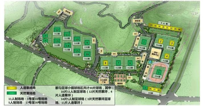 都匀足球小镇(以下简称“足球小镇”)于2016年12月在都匀经济开发区启动建设,2017年7月初步建成。项目总用地面积837.92亩:球场区占地600亩,共有30片足球场,其中11人制16片、5人制14片。