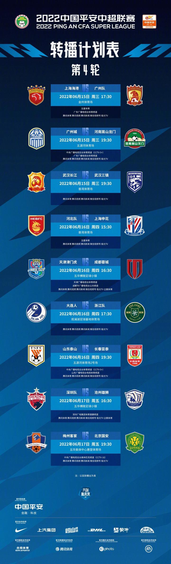 6月15日-17日,2022赛季中超联赛第4轮将在大连、梅州、海口3个赛区进行。14日,中超官方发布了本轮9场比赛的转播计划表。