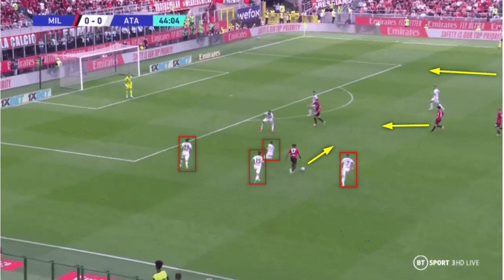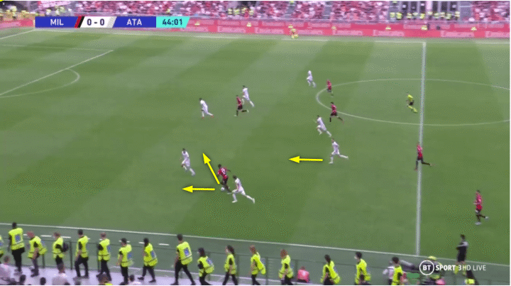 你可以看到他是如何切入内线并将四名亚特兰大球员带离位置的。这给其他米兰球员创造了进攻空间,从而给米兰留下了一个很好的进攻机会,也使他们在进攻三区获得了人数优势。