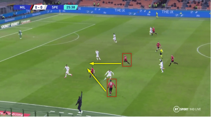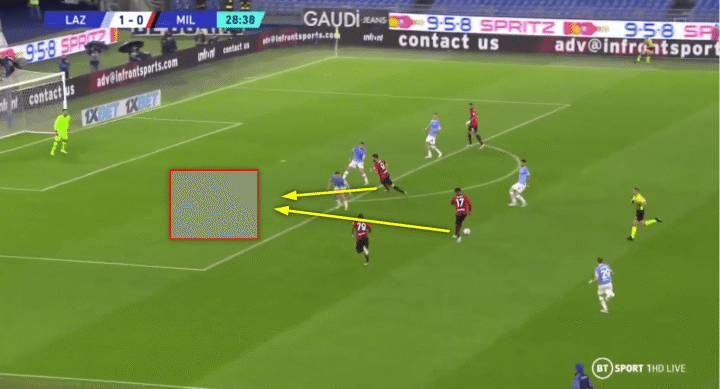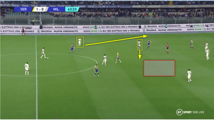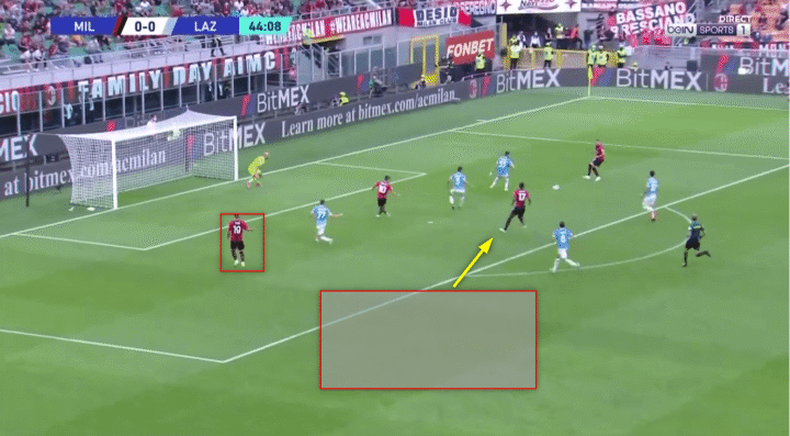 他往内线的跑动将维罗纳的后卫拉到中路,让米兰能够打穿对手防线。一旦发生这种情况,特奥就会进攻这个空间,为米兰提供宽度,从而拉开维罗纳的防守结构。而莱奥在中路占据的位置为米兰制造了威胁,并造成了中路的人数优势。