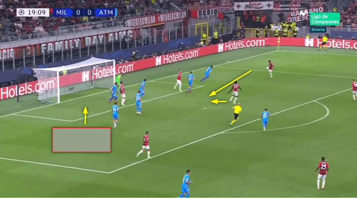 与马德里竞技的比赛中,米兰再次在对方禁区制造出了人数优势。莱奥本可以进攻远门柱。但他判断到了比赛接下来的方向,于是横穿马竞的防守,这对他们的后卫造成了一系列的反应,这种类型的跑动将会把后卫拉离位置。