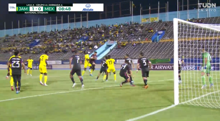 第4分钟,牙买加先进球了!11号沙马尔·尼科尔森左路传中,7号利昂·贝利头球破门!牙买加1:0领先墨西哥。