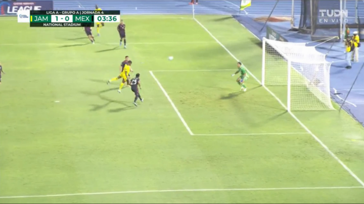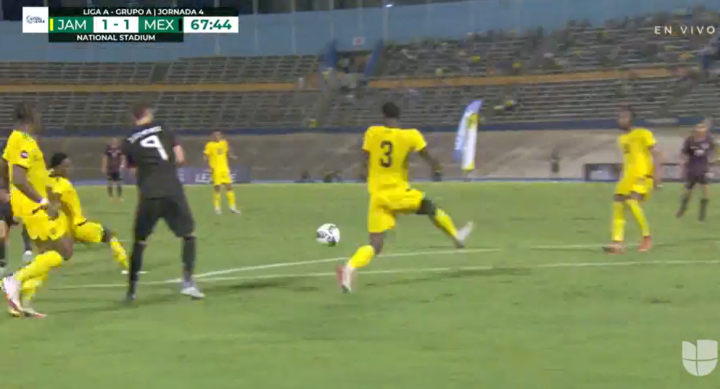 第51分钟,牙买加的快速反击,利昂·贝利送出直塞,17号达米恩·洛推射被墨西哥球员用腿挡下,但球即将飞进球门之际,被回追的2号凯文·纳因·阿尔瓦雷斯在门前解围!