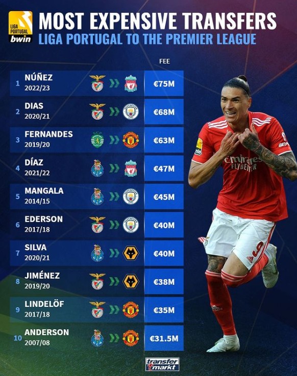 利物浦签下了本菲卡前锋努涅斯,努涅斯的转会费是7500万欧元,他也是从葡超加盟英超的球员中转会费最高的。德国知名足球数据网站“转会市场”统计了从葡超加盟英超球员的转会费,努涅斯排名第一,鲁本-迪亚斯和B-费尔南德斯分列二三。