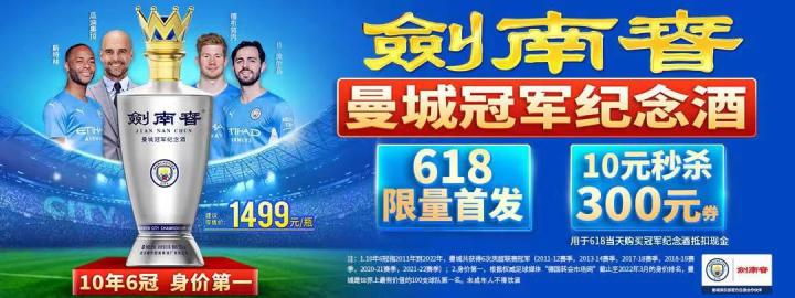 来到今日,随着曼城再度赢得英超冠军,作为足球领域投放最多的中国白酒行业品牌,剑南春怎能缺席荣耀时刻?如前文所述,剑南春结合曼城“10年6冠,身价第一”的卓越成绩,特别推出了“曼城冠军纪念酒”。最重要的是,这款“曼城冠军纪念酒”在618全球限量首发3万瓶,每瓶都有一本专属收藏证书与唯一编号,绝对是广大球迷不可多得的重要收藏品。
