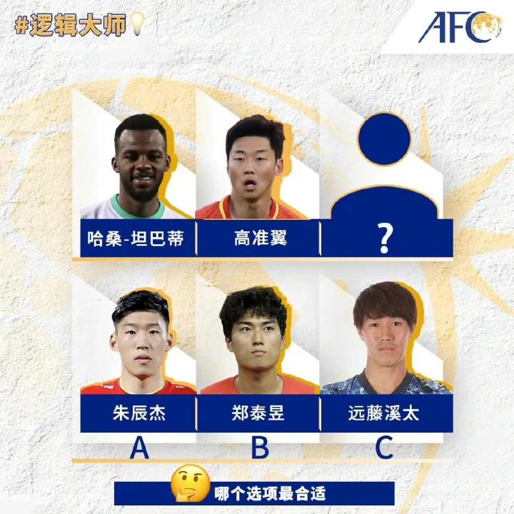 哈桑-坦巴蒂和高准翼都曾是U23国家队的重要一员...亚足联 @懂球帝2022-06-17 18:08哈桑-坦巴蒂和高准翼都曾是U23国家队的重要一员。 你能根据他们之间的共同点,从以下三名球员中选出正确选项吗? 各位逻辑大师快在评论区留下答案!展开更多