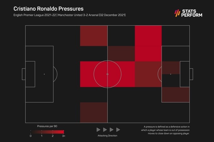 (图)在索尔斯克亚和卡里克麾下,C罗每90分钟完成14.4次逼抢。朗尼克上任后的首场比赛(VS水晶宫),这个数据翻了一番(27次),但如此剧烈的消耗注定难以久持。