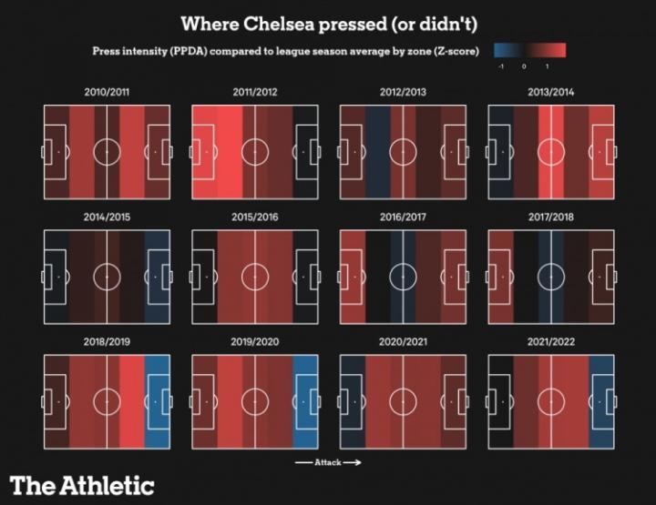 (图)阿布时代的切尔西在场上压迫区域分布,这支过往以低位防反著称的球队在过去12年中经历了一个不断向前的过程。