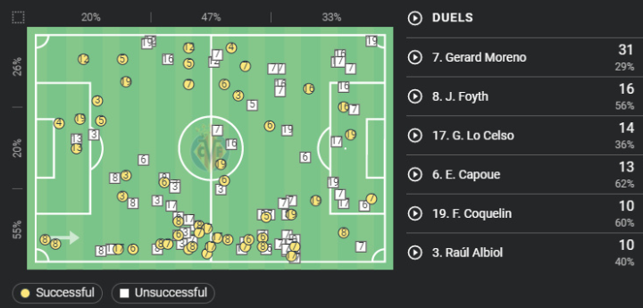 (图)2021/22赛季欧冠半决赛次回合,比利亚雷亚尔上半场完成123次对抗,远超平均水平,依托边线实施绞杀的策略非常明显。