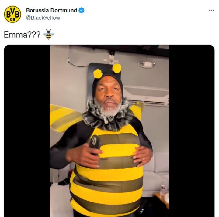 拳王泰森化身小蜜蜂,多特社媒疑惑转发ForzaBan @懂球帝2022-06-17 22:19近日,前世界重量级拳王迈克-泰森在参加一档电视节目时将自己扮成了一只小蜜蜂,随后多特蒙德俱乐部官方也转发了这则视频,并配以疑惑的表情。这段视频中,泰森穿着小蜜蜂一样的衣服进行了一段即兴歌舞,还表示他觉得自己“变美丽了”。这段搞怪视频在随即在网络中爆火,也获得了有着“大黄蜂”之称的多特蒙德的关注,后者转发了这则视频,还顺带cue了自家的吉祥物蜜蜂Emma。展开更多