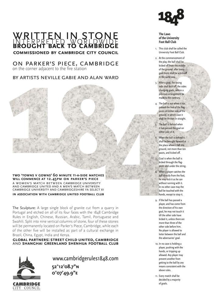 1848年,足球运动的第一个文字形式的规则《剑桥规则》(Cambridge rules)诞生了,其中包含了11 条规则,最初的目的是为了规范牛津大学和剑桥大学之间的足球比赛。