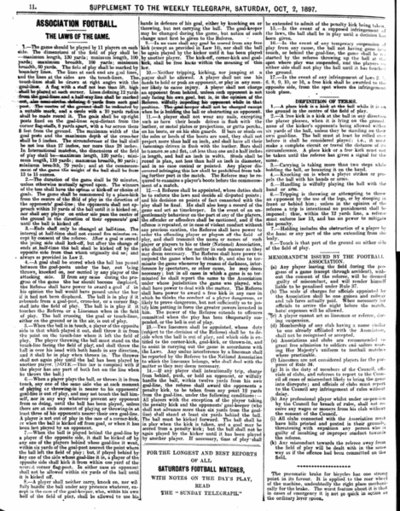 FA在10月到12月期间在酒馆里举行了五次会议,这才产生了第一版足球的全面规则,但在这套规则中也没有规定参赛球员的数量。