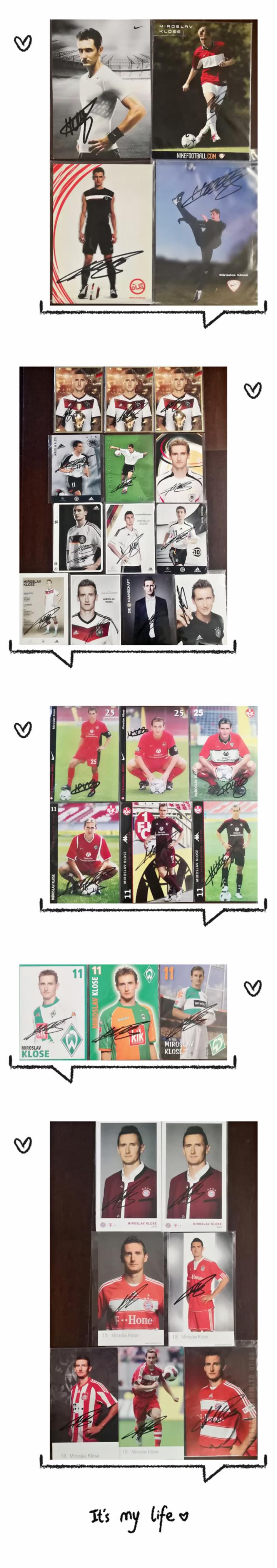 前世界杯冠军成员,凯泽斯劳滕,不莱梅,拜仁,拉齐奥的功勋球员,带我进入足球世界的绝对男神,米洛斯拉夫·克洛泽终于出山啦!看到这个消息的我激动不已,又可以写信,又可以有克洛泽的亲笔签名卡了……这边给大家展示一下我目前拥有的大部分克洛泽的签名卡。(拉齐奥以及不莱梅稀缺版没拍)