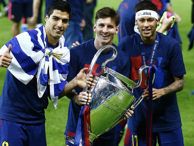 “N”内马尔(Neymar):拥有穿花蝴蝶般绚丽脚法,如幻影疾风,屡次上演单骑叩关。2013年夏天,当巴萨以5000万欧元签下这位巴西新星时,是为了给梅西找一个接班人。2014/2015 赛季内马尔完成惊艳蜕变,他一共为巴萨攻进39球,还贡献了 11 次助攻,并屡建奇功,其中就包括独中三元,率领巴萨以6比1击败巴黎圣日耳曼的那场惊天大逆转。