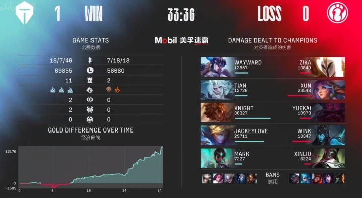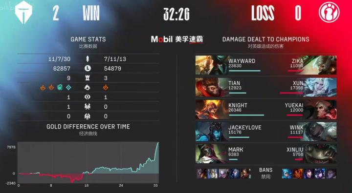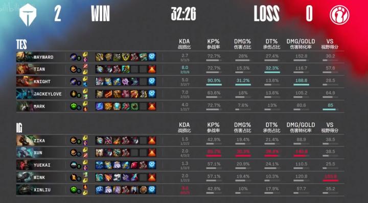 第33分钟,TES推进击杀IG五人一波结束比赛,恭喜TES先下一城。