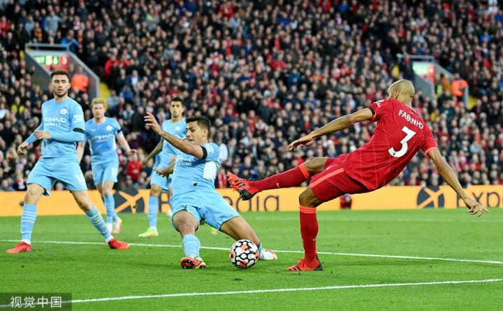 利物浦中场法比尼奥拿到了球,并在曼城防守无法恢复的情况下瞄准了一个空位,射门。