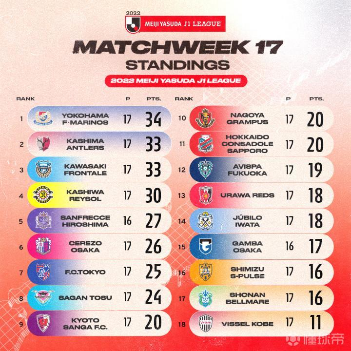 J联赛第17轮战罢最新积分榜.