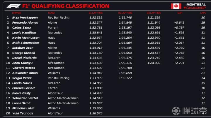 F1加拿大站排位赛:维斯塔潘杆位,周冠宇生涯首次晋级Q3!