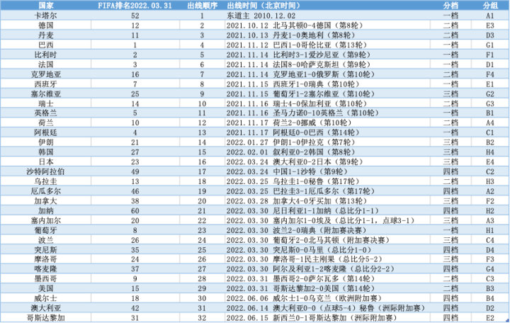 截止至北京时间2022年6月15日,32支国家队全部出炉,晋级顺序和晋级时间如下: